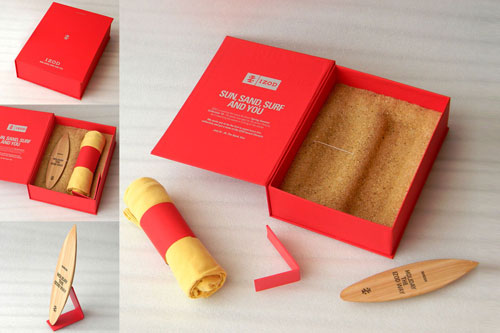 Fabricated personalised scale model of wooden surf board for iZod India, as an invite for their launch of summer collection in Goa. The handmade packaging box contain segmented sand bed to hold the surf board model and a t-shirt gift from iZod.