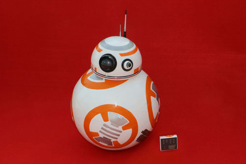Created with FRP, PVC, Metal and Magnets. Powered by 12v rechargeable battery, controlled by RF Remote. It can make sounds, blink eyes and rotate head while rolling its body.